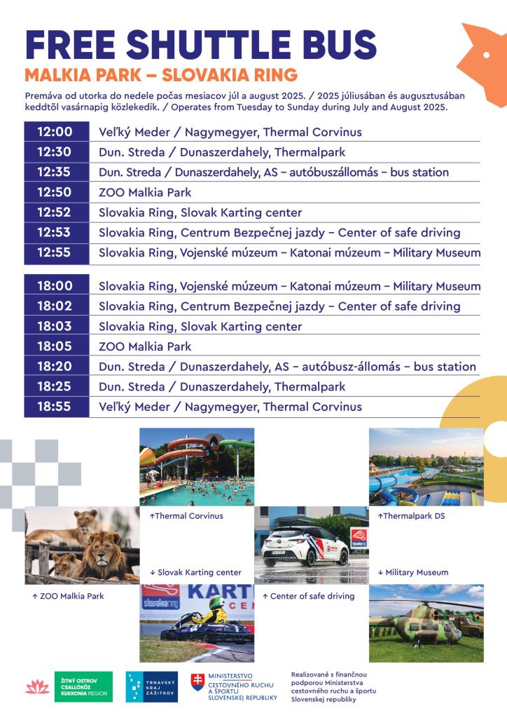 A Csallóköz Területi Idegenforgalmi Szövetség az idei nyár folyamán (júliusban és augusztusban, hétfők kivételével) ingyenes buszjáratot indított, amely a régió négy kiemelt turisztikai attrakcióját köti össze. A járat Nagymegyerről, a fürdő elől indul, útba ejti a dunaszerdahelyi termálfürdőt és a buszállomást, majd végállomásként a dióspatonyi Malkia Park állatkertet, illetve a Slovakia Ring motorsportközpont különböző részeit – beleértve a gokartpályát, a biztonságos vezetéstechnikai pályát, valamint a Katonai Múzeumot is. A visszaútra szintén van lehetőség.